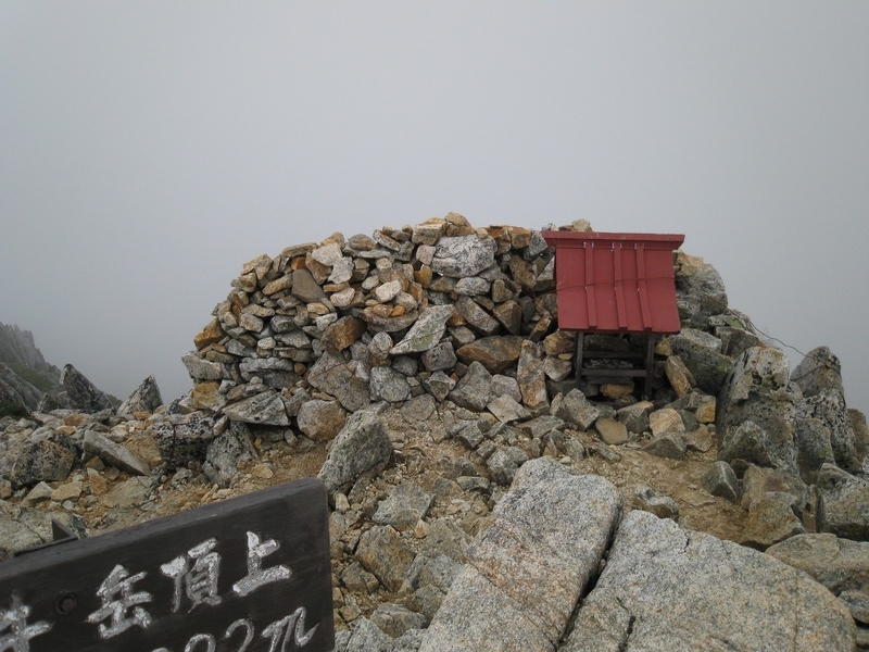 2012-10-05 大天井岳 登山 #登山 槍ヶ岳の帰りに時間があれば大天井岳に登ろうと想っていました。 少し時間に余裕が出来たので大天井まで登りました。 大天荘から往復で20分程度です。 大天井岳山頂はずっとガスの中で展望はありませんでした。 自分にとってはおよそ十年ぶりくらいの登頂です。